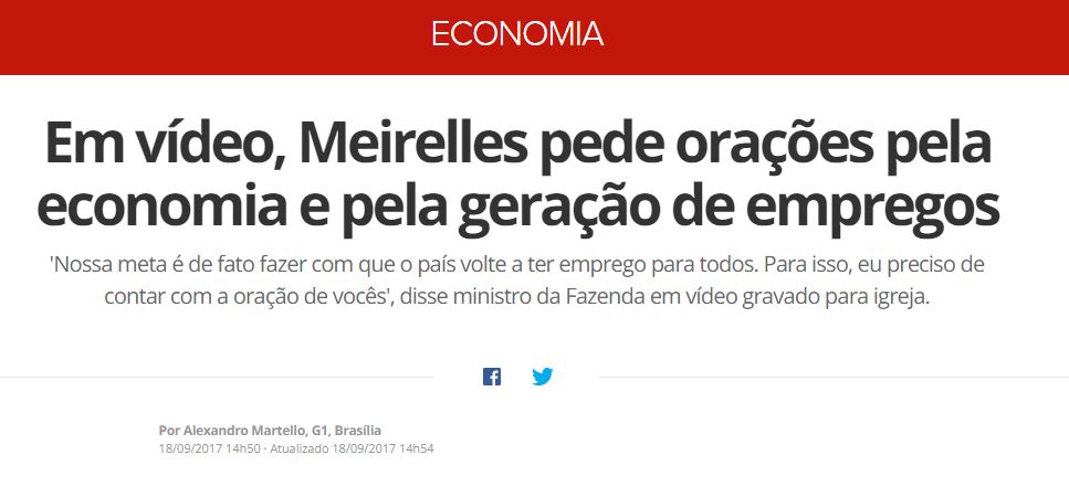 Um belo dia esse cara manda um vídeo pra galera da Assembléia de Deus pedindo orações pela economia. Do nada pouco que eu pesquisei, Henrique Meirelles não é um membro da Assembléia. Apesar de ter uma boa relação com a instituição, nas matérias que eu li a religião dele não é citada em momento algum. Aí o cara aparece abertamente pedindo orações pela economia. Ele não comentou com a tia dele que vai pro círculo de oração que ela colocasse o Brasil na lista de pedidos de oração. Ele não pediu isso pelo Whatsapp pro pastor que é brother dele. Ele mandou um vídeo convocando milhares, talvez milhões de pessoas, para uma campanha de oração em prol da economia do Brasil que vai durar o mês de outubro inteiro. Eu sou um cara religioso, cristão protestante, evangélico, crente ou, como diriam alguns, idiota bitolado. Eu acredito no poder da oração e que a fé é uma coisa muito poderosa, mas também sei que quem não é religioso acaba encarando isso como um último recurso. Deus é o último recurso de muita gente, inclusive de alguns religiosos, e quando você vê um cara do quilate do Ministro da Fazenda apelando pra intervenção divina não tem como pensar outra coisa. Se apelou é porque deu merda pra valer.